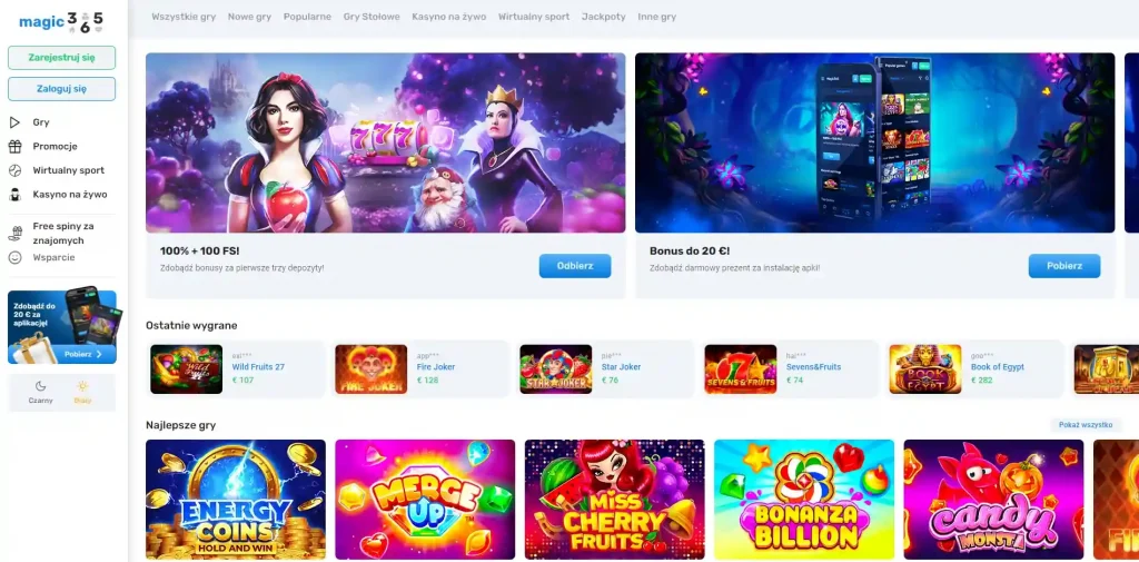 Nowi gracze mogą skorzystać z bonusu powitalnego Magic365, który wynosi do 1000 PLN przy pierwszym depozycie. To świetny sposób na rozpoczęcie przygody z kasynem.